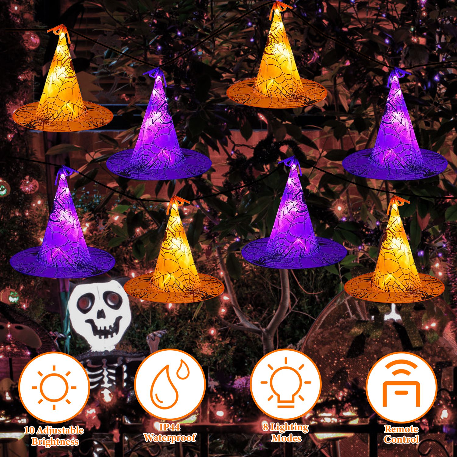 8 Pack 13FT Witch Hat Hanging String LED Light Halloween Decoration Battery Powered Remote Control 8 Lighting Modes Glowing Outdoor Indoor Halloween P