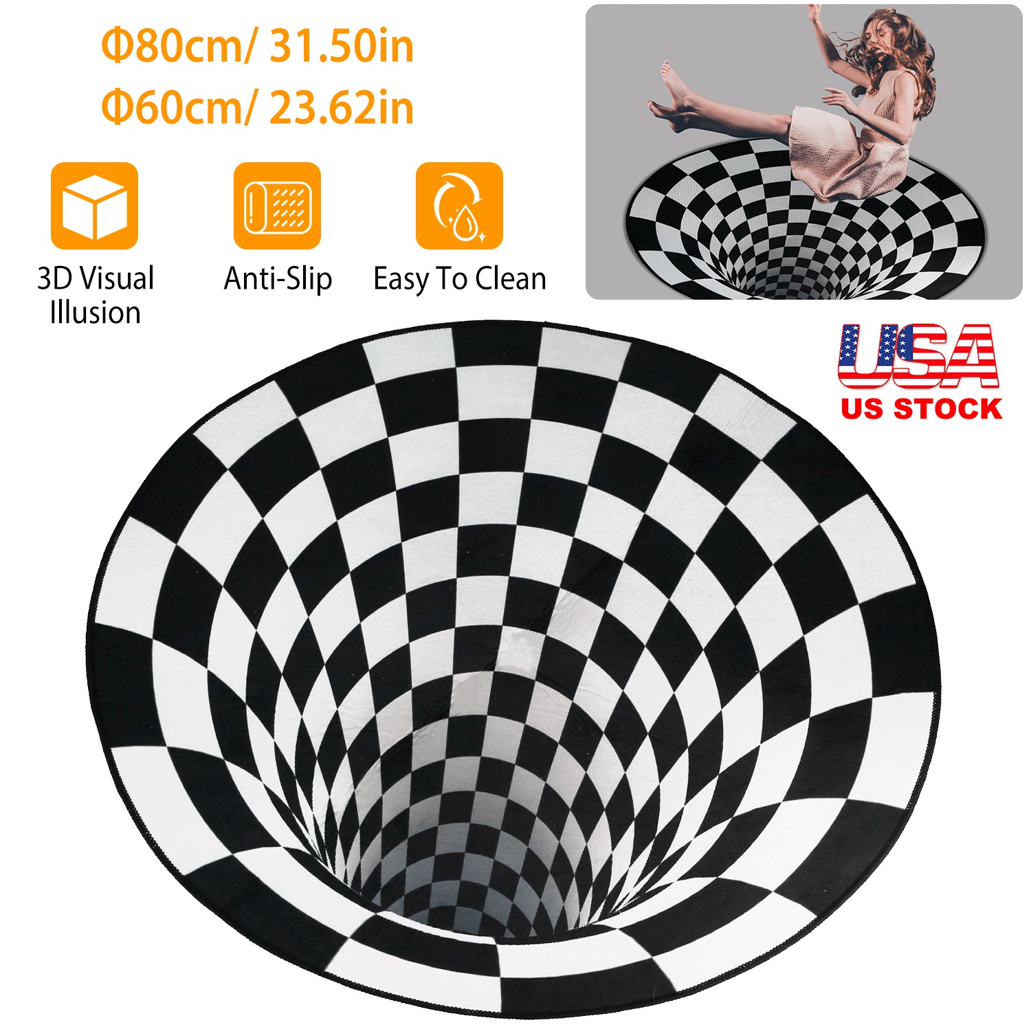 Our creative floor mat is featured with black and white checkered design that produce an optical illusion. Made of soft polyester fiber, non-toxic, odorless, soft to the touch. Anti-slip backing helps prevent sliding. A great decoration for children\'s bedrooms, dormitories, front door, etc..