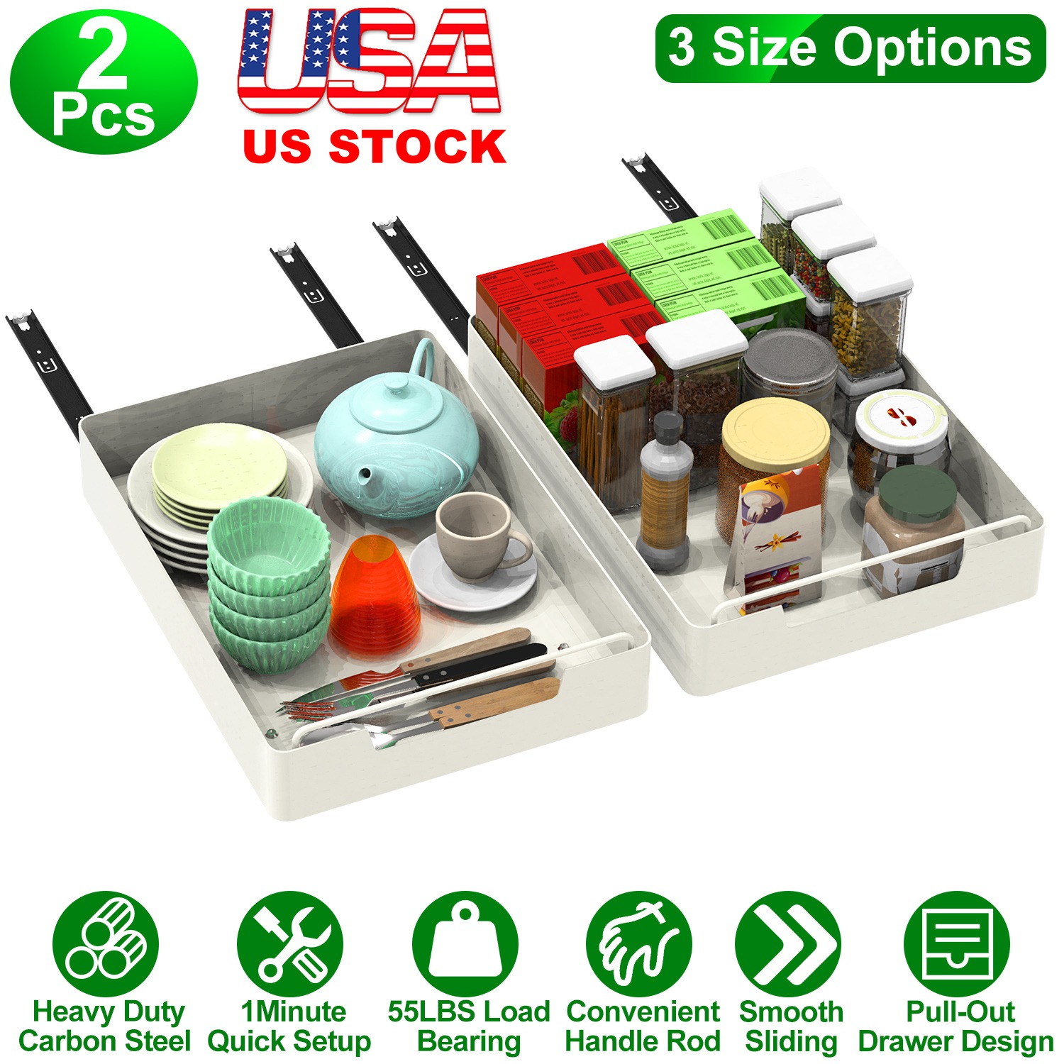 2Pcs Pull Out Cabinet Organizers Sliding Shelf Spice Rack Carbon Steel Roll Out Drawers Fixed with Adhesive Nano Film with Handle 55LBS Max Load